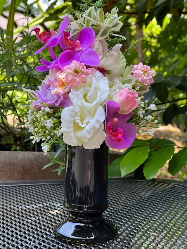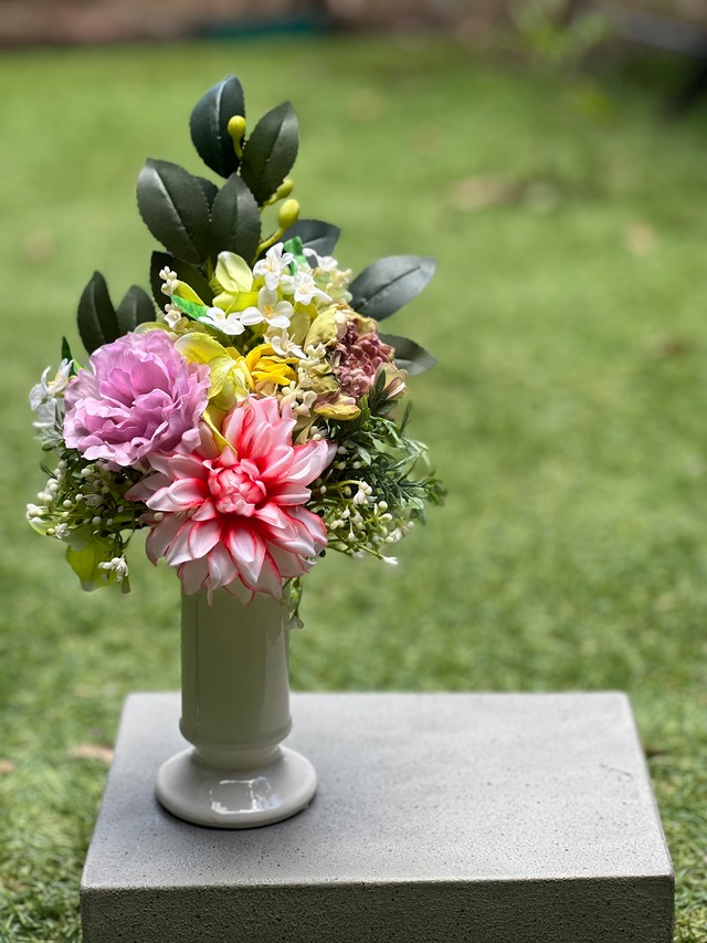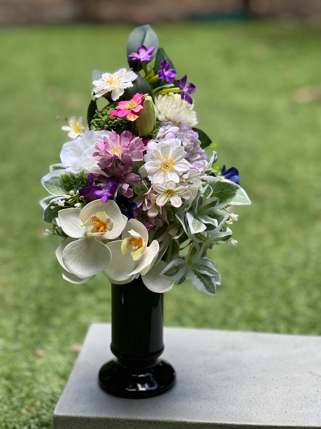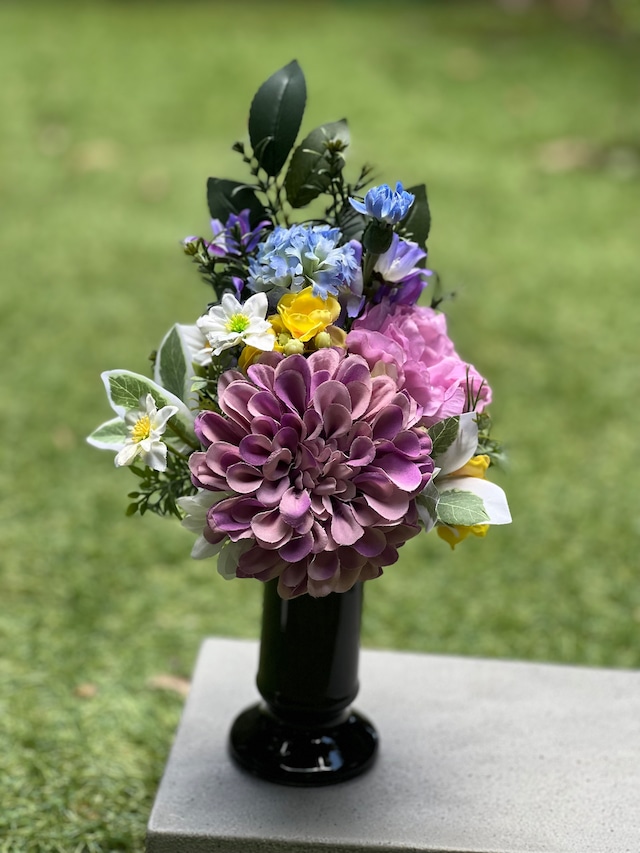 フラワーデザイナーが作る お水の要らないお仏花です。 既存のアートフラワーより よりリアルに より上質な素材で仕上げた アーティフィシャルフラワーでお作りしております。 【Mサイズ】 お花の部分 高さ約21センチ 横幅 約14センチ 厚み 約10センチ ハンドル部分の長さ 約7センチ 全長 約27㎝ *花立は付属しておりません。 花立もご必要な場合は 当店でも販売しておりますので 別途お買い求めくださいませ。 *対でご必要なお客様はご注文数を 「2」でご記入くださいませ。 (注:在庫が2になっているものに限ります。ご了承くださいませ)