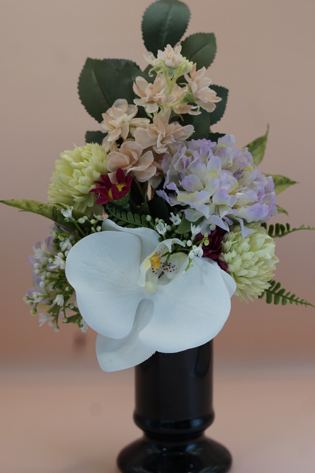 フラワーデザイナーが作る お水の要らないお仏花です。 既存のアートフラワーより よりリアルに より上質な素材で仕上げた アーティフィシャルフラワーでお作りしております。 【Sサイズ】 お花の部分 高さ約18〜20センチ 横幅 約12センチ 厚み 約10センチ ハンドル部分の長さ 約6センチ 全長 約26cm *花立は付属しておりません。 花立もご必要な場合は 当店でも販売しておりますので 別途お買い求めくださいませ。 *対でご必要なお客様は ご注文数を「2」でご記入くださいませ。 (注:在庫が2になっているものに限ります。ご了承くださいませ)