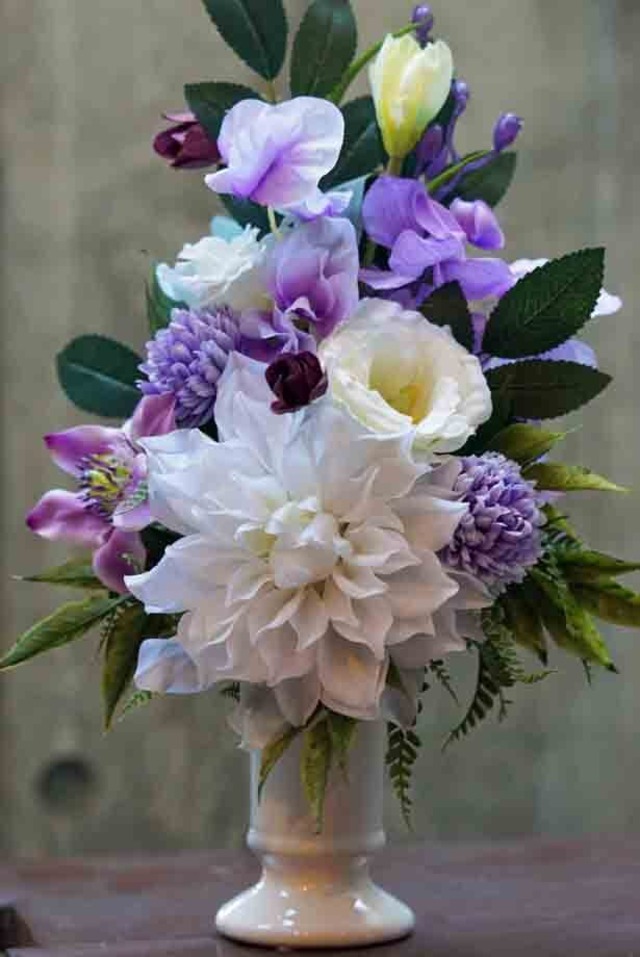 フラワーデザイナーが作る お水の要らないお仏花です。 既存のアートフラワーより よりリアルに より上質な素材で仕上げた アーティフィシャルフラワーでお作りしております。 【花材】 ダリア・ヒサカキ・トルコキキョウ・モカラ・ スイトピー・クレマチス・ミックファーン 【Lサイズ】 お花の部分 高さ約27センチ 横幅 約16センチ 奥行き 約10センチ ハンドル部分の長さ 約7センチ 全長 約34㎝ *花立は付属しておりません。 花立もご必要な場合は 当店でも販売しておりますので 別途お買い求めくださいませ。 *対でご必要なお客様は ご注文数を「2」でご記入くださいませ。 (注:在庫が2になっているものに限ります。ご了承くださいませ)